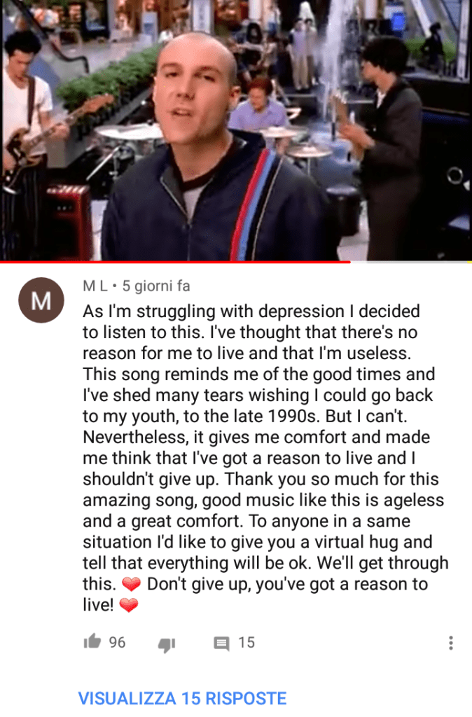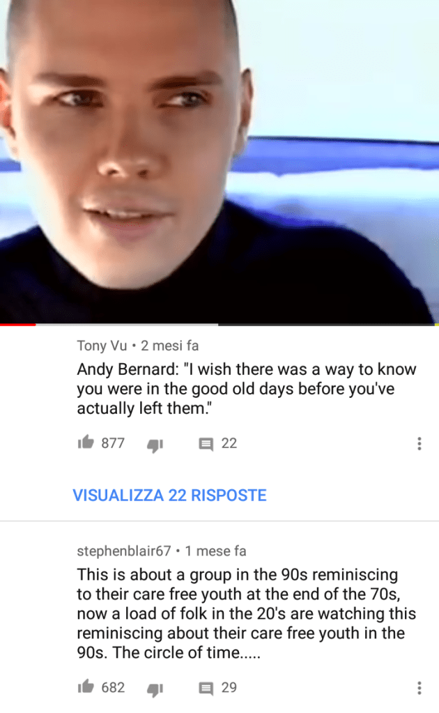 Ad ogni modo, qualche giorno fa, nel corso del mio giro della morte, mi sono messo a leggere i commenti ai video di allora su Youtube. C’è chi si è rimesso ad ascoltare la musica della sua adolescenza durante il lockdown, chi è depresso dal 1994 e non si è ancora ripreso, chi più lucido afferma che in alcuni casi quella per gli anni ’90 è una nostalgia di una nostalgia (vedi 1979 degli Smashing Pumpkins), dunque di un periodo (e di un luogo) inesistente…